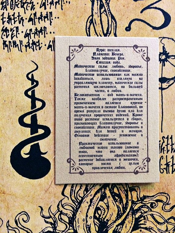 На каждой карточке расписано - аура растения, соответствие знака зодиака, планета, стихия, магическое использование и сила растения.