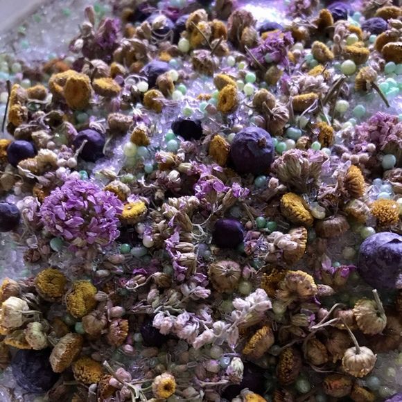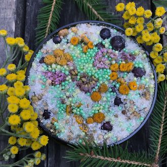 Для приятного визуала я добавила в соль разноцветный косметический бисер и травы - пижмы, тысячелистника, ягоды можжевельника и кипариса.
