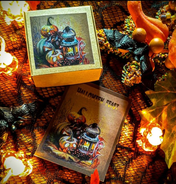 Набор упакован в коробочку, оформленную хеллоуинской наклейкой и ей в компанию - маленькой авторской открыткой.